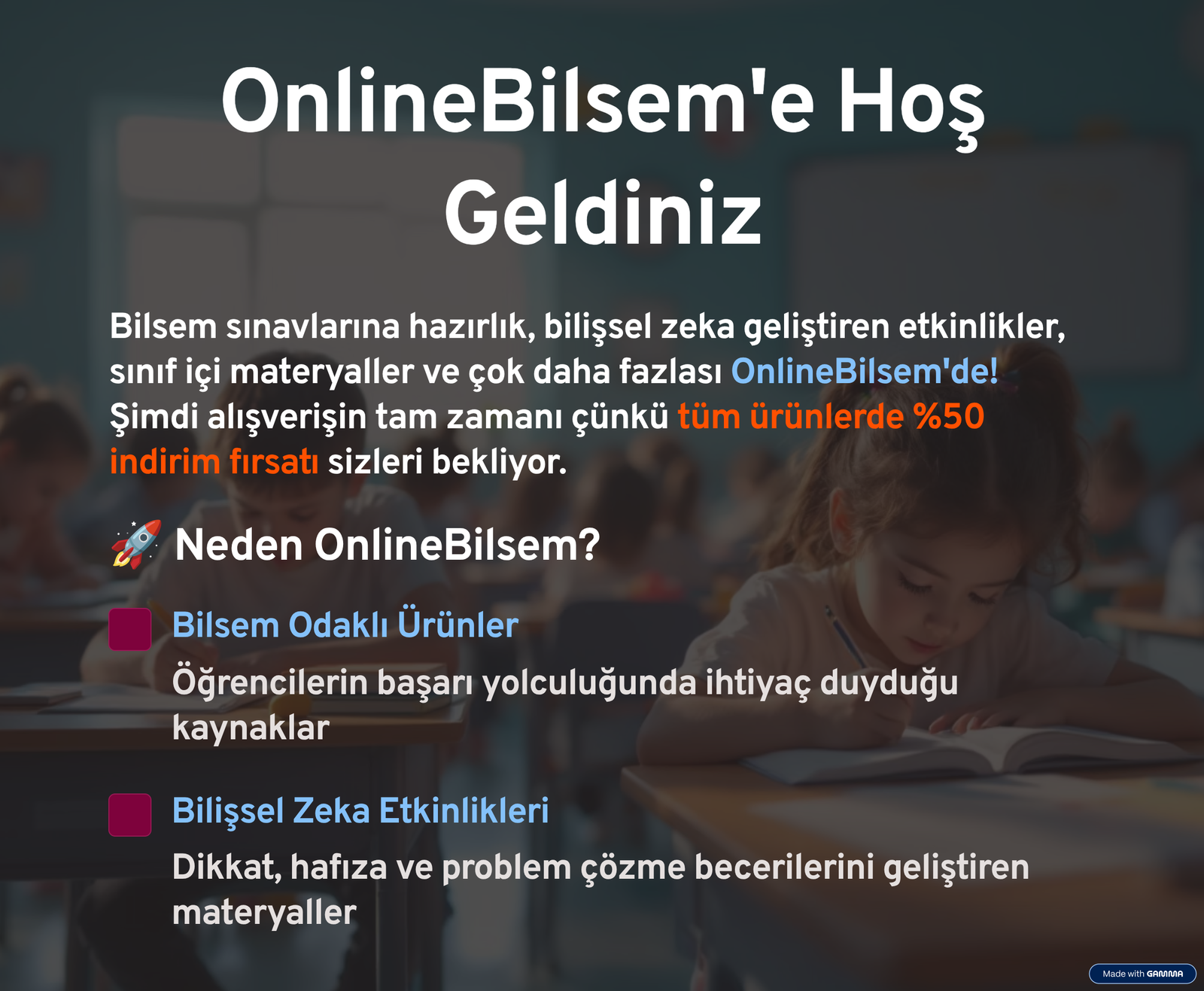 Bilsem sınavına hazırlanmak isteyen öğrenciler, doğru kaynaklara ulaşmakta zorlanabiliyor. İşte tam da bu noktada OnlineBilsem devreye giriyor. Çünkü biz, öğrencilerin başarı yolculuğunu desteklemek için özenle seçilmiş kitaplar, deneme testleri, sınıf içi materyaller ve bilişsel zeka geliştiren etkinlikler sunuyoruz.